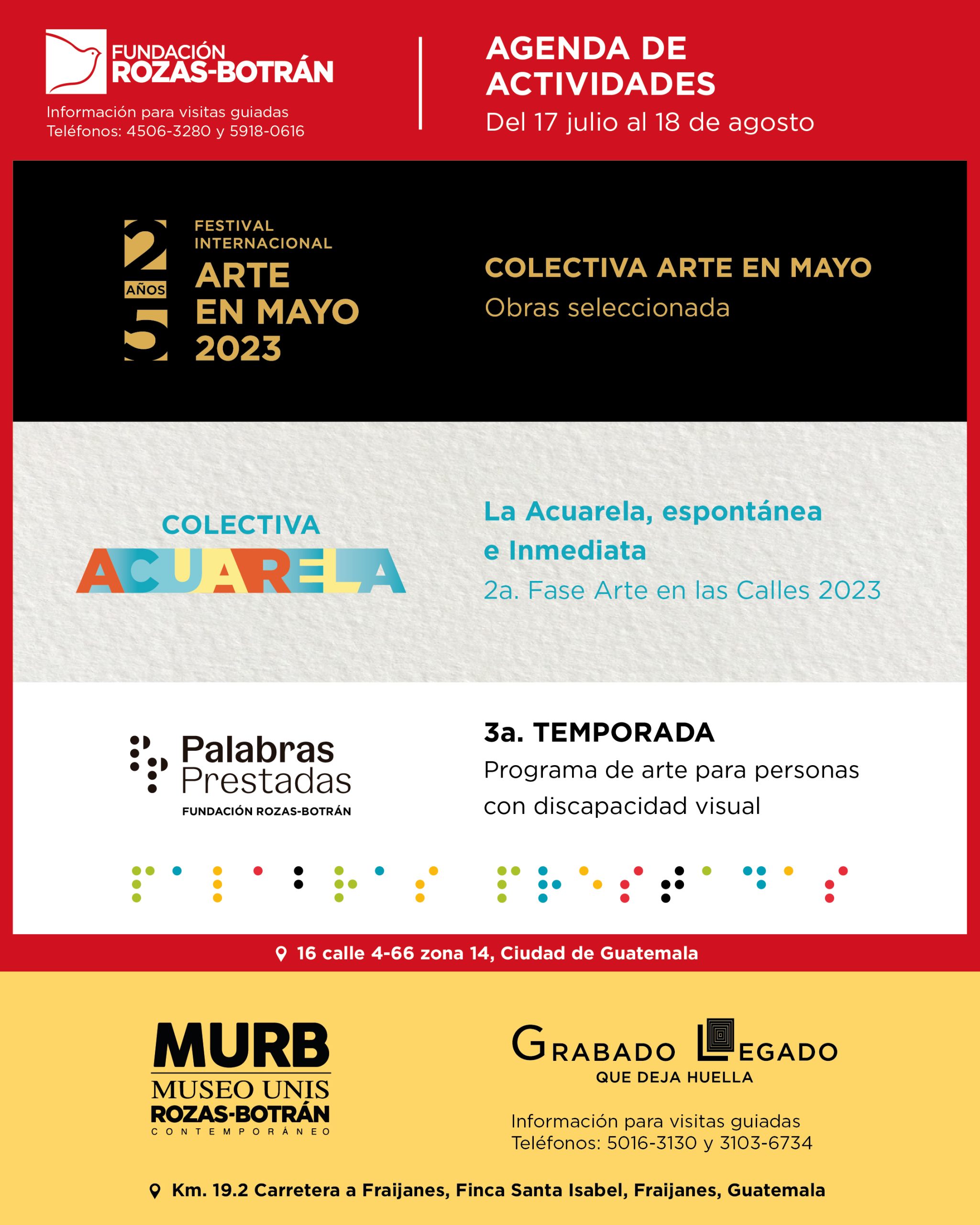 Conjunto de actividades de arte como exposiciones, acuarela para niños y un programa de arte para personas con discapacidad visual
