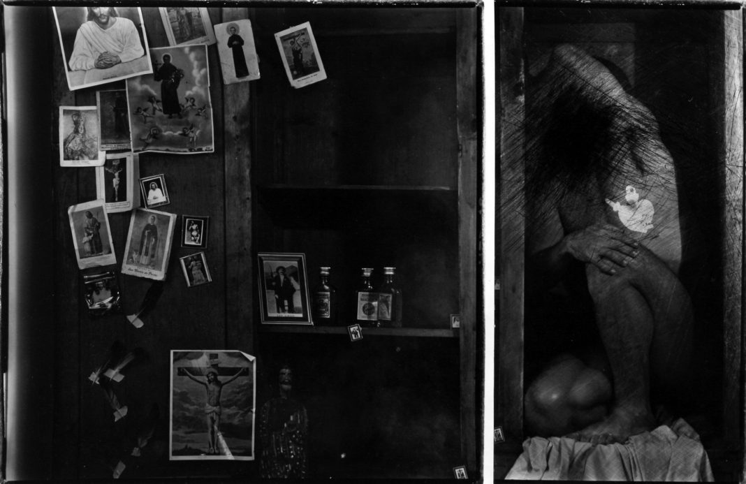 Esta obra de Luis González Palma explora el simbolismo religioso y la introspección emocional mediante una composición dual. A la izquierda, una pared de madera adornada con imágenes religiosas, fotografías familiares y pequeños objetos crea una sensación de devoción e intimidad, reflejando el peso de la tradición y la espiritualidad. A la derecha, un cuerpo desnudo y encorvado, con la cabeza cubierta por sombras, transmite vulnerabilidad y aislamiento.