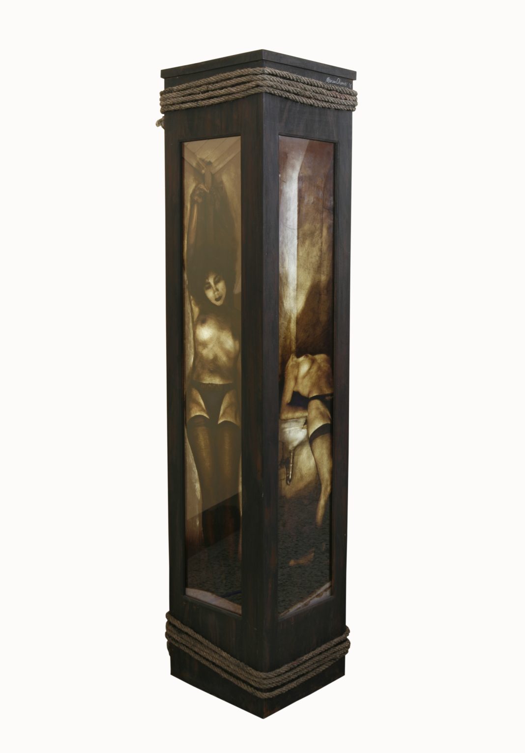 La pieza galardonada, El relicario, consiste en una columna de madera de cuatro caras, rodeada de paneles de vidrio intervenidos con fotografías verticales que revelan la desnudez de la corporalidad femenina. Las imágenes en tonos sepia se integran armónicamente con el tono ocre de la madera y las cuerdas que envuelven la estructura, creando un efecto de nostalgia y equilibrio visual. Este conjunto de materiales y texturas transforma la pieza en un objeto que invita a una contemplación íntima y reflexiva sobre la vulnerabilidad y la memoria.