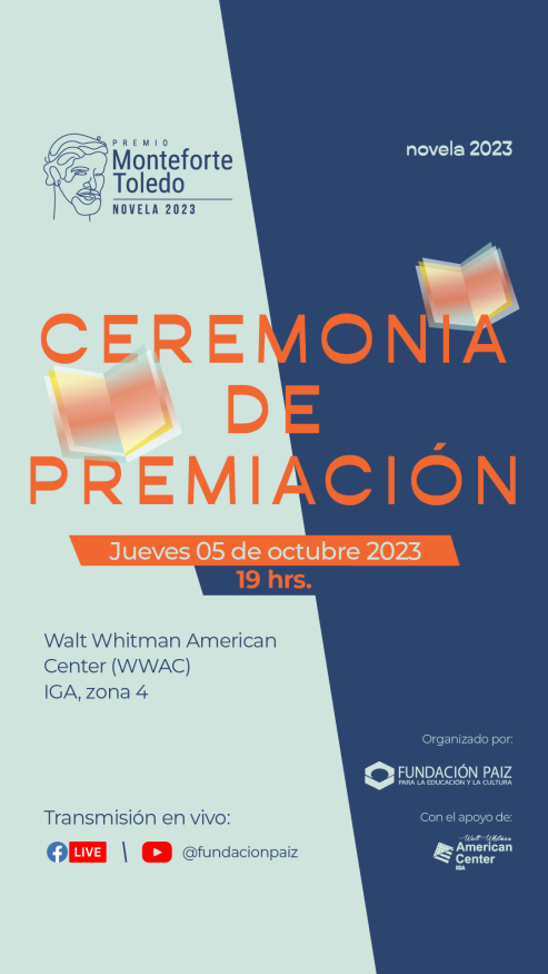 Fundación Paiz te invita a la premiación del certamen literario “Premio Monteforte Toledo Novela 2023”. La gala de premiación se llevará a cabo el jueves 5 de octubre a las 19 horas en Walt Whitman American Center (WWAC), IGA, zona 4. En la ceremonia se conocerá a la persona ganadora del certamen y a los integrantes del Jurado Calificador. También se entregará un diploma, un galardón y Q50,000.