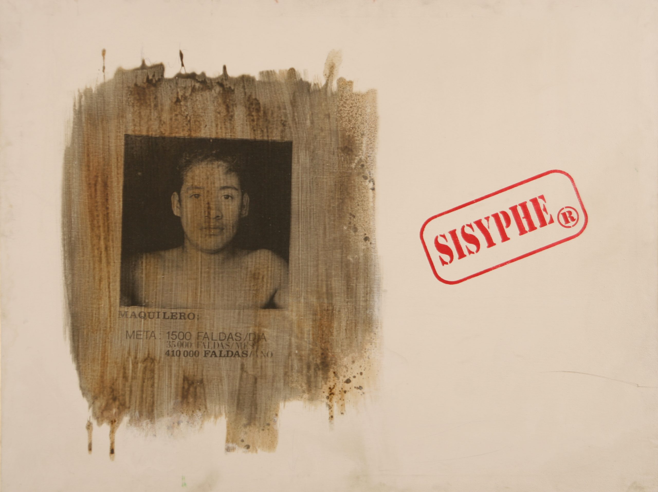 El segundo lugar dentro de la categoría fue otorgado a una pieza sin título, en la que el artista Sylvestre Gobart presentó el retrato de un hombre cubierto parcialmente por una mancha de pigmento, acompañado por la palabra Sisyphe, en alusión al mito de Sísifo, personaje asociado a actos absurdos y repetitivos. En la imagen, el retratado aparece junto a una ficha que contiene el término «Maquilero», junto con cifras que refieren a miles de faldas por producir.