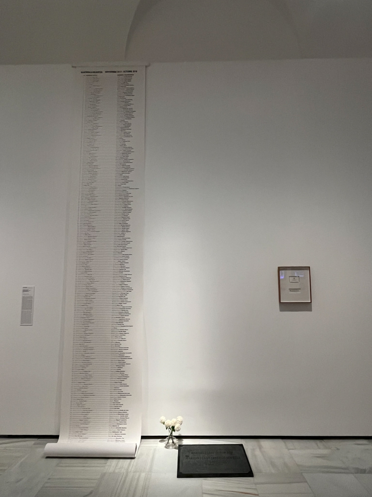 Esta exclusión e invisibilización también se ejemplifica en la serie de piezas de Marilyn Boror, titulada Edicto Cambio de Nombre, dónde el espectador se vuelve testigo de cómo un simple acto administrativo contribuye a la invisibilización y la asimilación forzada mediante actos simbólicos como el cambio de un nombre o un apellido. La obra, Archivo de los muertos, inmediatamente llama la atención del espectador al entrar a la sala, con una extensión de ocho metros de longitud. Está compuesta por una lista de nombres de origen maya y sus versiones castellanizadas, evocando un registro oficial o un memorial. La pieza es un acto de resistencia, que resalta a las personas cuyas identidades han sido desplazadas.