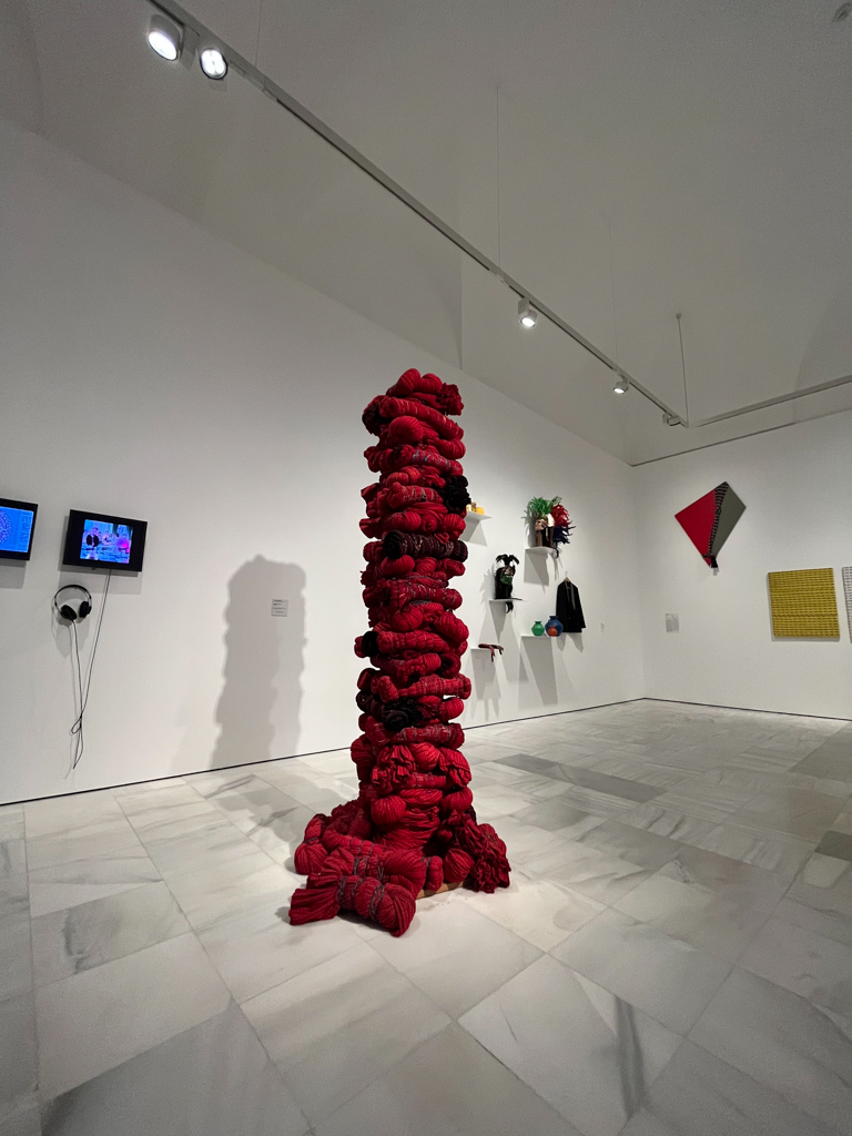 El impulso de mantener viva la historia y la tradición ante la marginación se materializa en la obra central de la sala, perteneciente a Sandra Monterroso. Su Columna Vertebral Roja (obra de 2017) se alza firme en el centro del espacio, llamando la atención de todo quien que entra en ella. Con casi dos metros y medio de altura, la escultura está hecha a base de cortes de telas enrolladas y 87 faldas tejidas artesanalmente sobre una estructura de metal y madera. Los textiles rojos de la obra son propios de la región de Las Verapaces y representan el legado q’eqchí de Monterroso. La obra crea un discurso sobre historias ocultas, su herencia familiar y los objetos importantes en su cultura. Sobre la obra, Monterroso comenta que «Al ser una columna vertebral, estamos hablando del cuerpo, el cuerpo de las mujeres, el cuerpo de las mujeres indígenas, el cuerpo de nuestras historias, el que sigue sosteniendo incluso no solo la humanidad, sino en el sentido de la relación con la naturaleza y el ecosistema y a nivel ecológico también”.