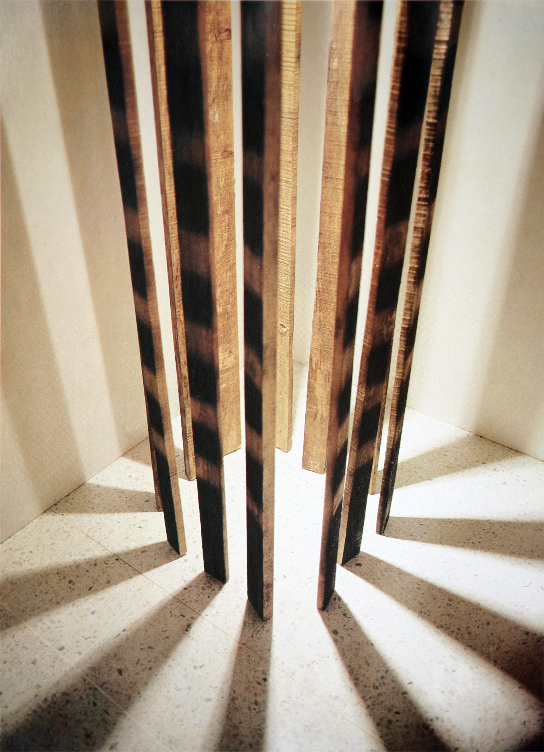 La instalación, elaborada por la salvadoreña Mayra Barraza explora la relación entre la luz, la sombra y la percepción. Compuesta por varias tiras de madera suspendidas verticalmente en un espacio cerrado y formando una disposición circular, deja ver un tratamiento rústico. El elemento más destacado es el juego de luces y sombras proyectadas sobre el suelo y las paredes circundantes: la iluminación desde un punto focal genera patrones geométricos simétricos y rayados, lo que enfatiza la naturaleza repetitiva y ordenada de la composición.