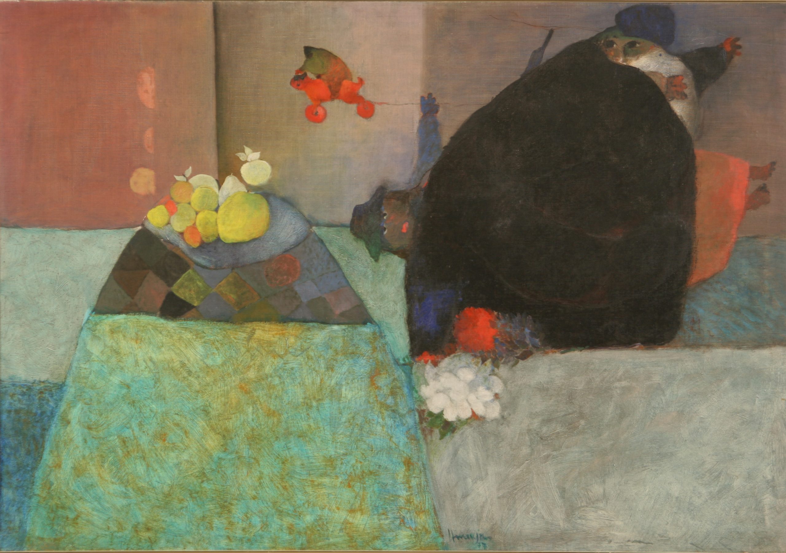 Con esta pintura Elmar René Rojas evidencia el interés por la espontaneidad que siguió el resto de su obra. Dentro de lo que parece ser un plano que no termina de revelarse entre el afuera o el espacio doméstico -considerado el plato de frutas sobre lo que podría ser una mesa-, Rojas celebra con esta pieza la frescura y la luminosidad de su paleta de colores; siendo estas decisiones pictóricas que sostuvo en la mayoría de sus piezas.