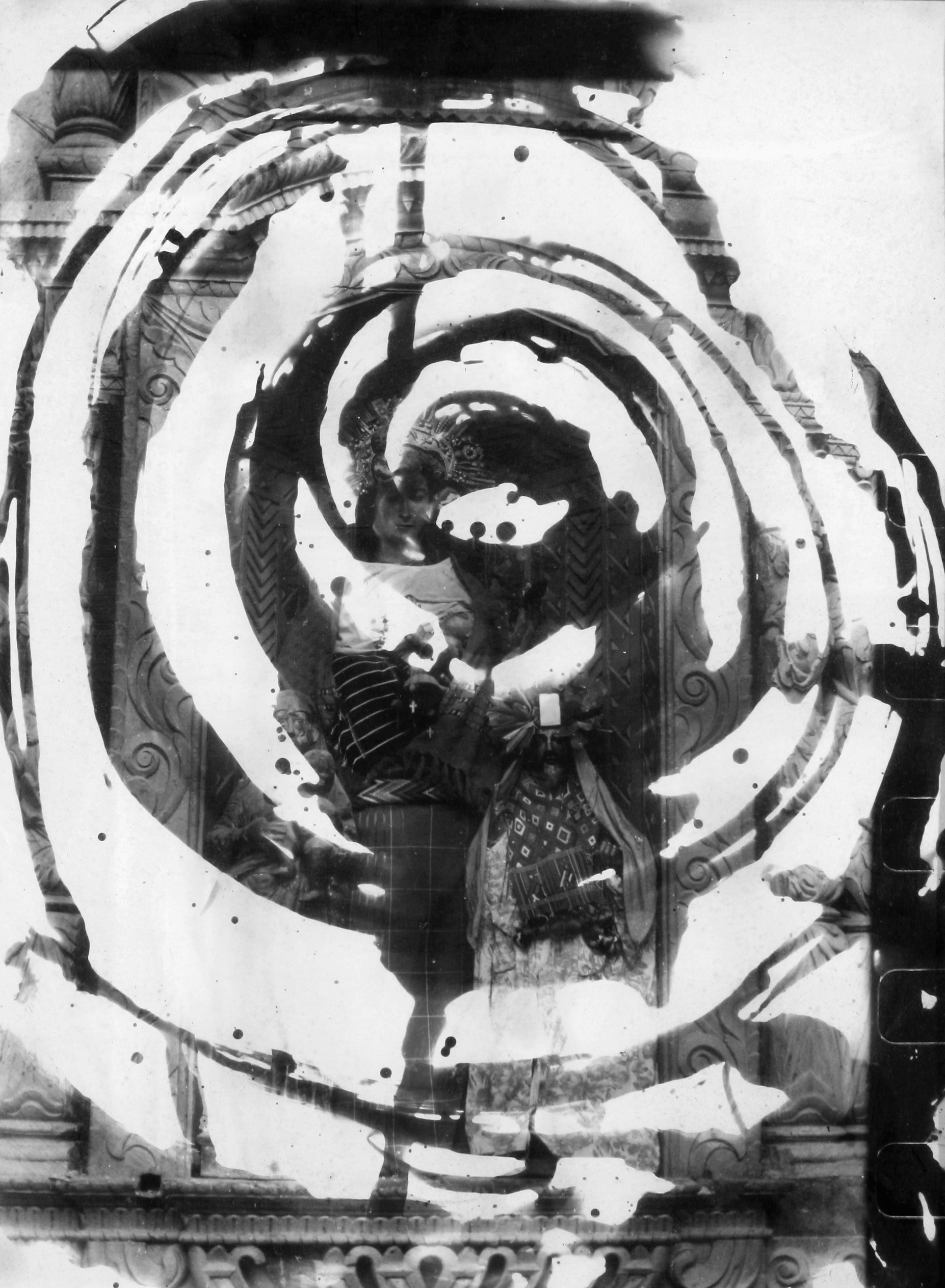 La imagen, de 12 x 16 pulgadas y capturada en blanco y negro, genera un fuerte impacto visual gracias a su técnica de doble exposición. En la multiplicidad de figuras, se distingue una Virgen María junto a otras dos figuras masculinas religiosas. Las tres tallas permanecen en una vitrina. A partir del reflejo del vidrio y del marco que contiene formas curvas, se genera un peso visual que realza un carácter psicodélico.