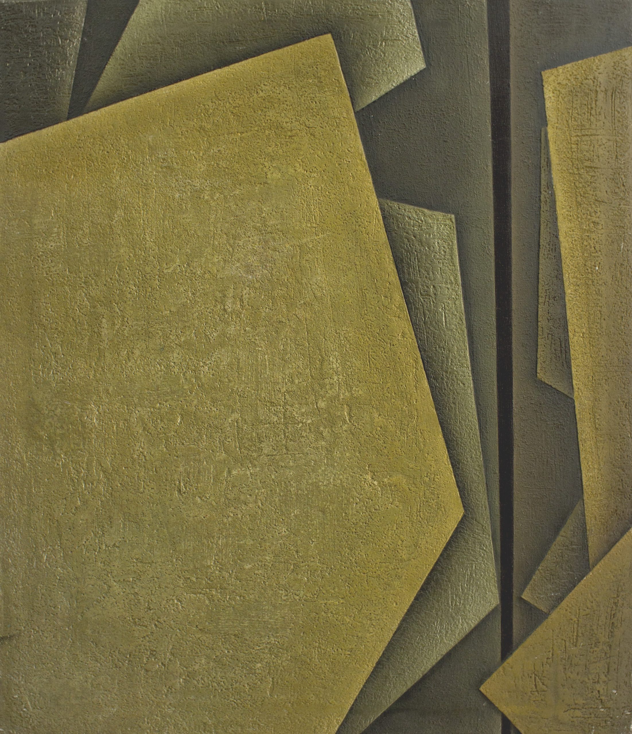 Con audacia pictórica, la autora Claudia Granados de Carlos explora el lenguaje abstracto mediante el uso de planos geométricos superpuestos y una paleta cromática dominada por tonos verdes y ocres. La composición se basa en formas angulares que crean una sensación de profundidad y dinamismo, mientras que la textura rugosa de la superficie añade una dimensión táctil que contrasta con la precisión geométrica de las líneas y los bordes. El juego de luces y sombras, logrado a través de un uso sutil de degradados y contraste tonal, refuerza la ilusión de volumen y espacio. La pieza refleja una influencia del constructivismo y el cubismo, fusionando elementos estructurales con una sensibilidad orgánica en la textura y la coloración.