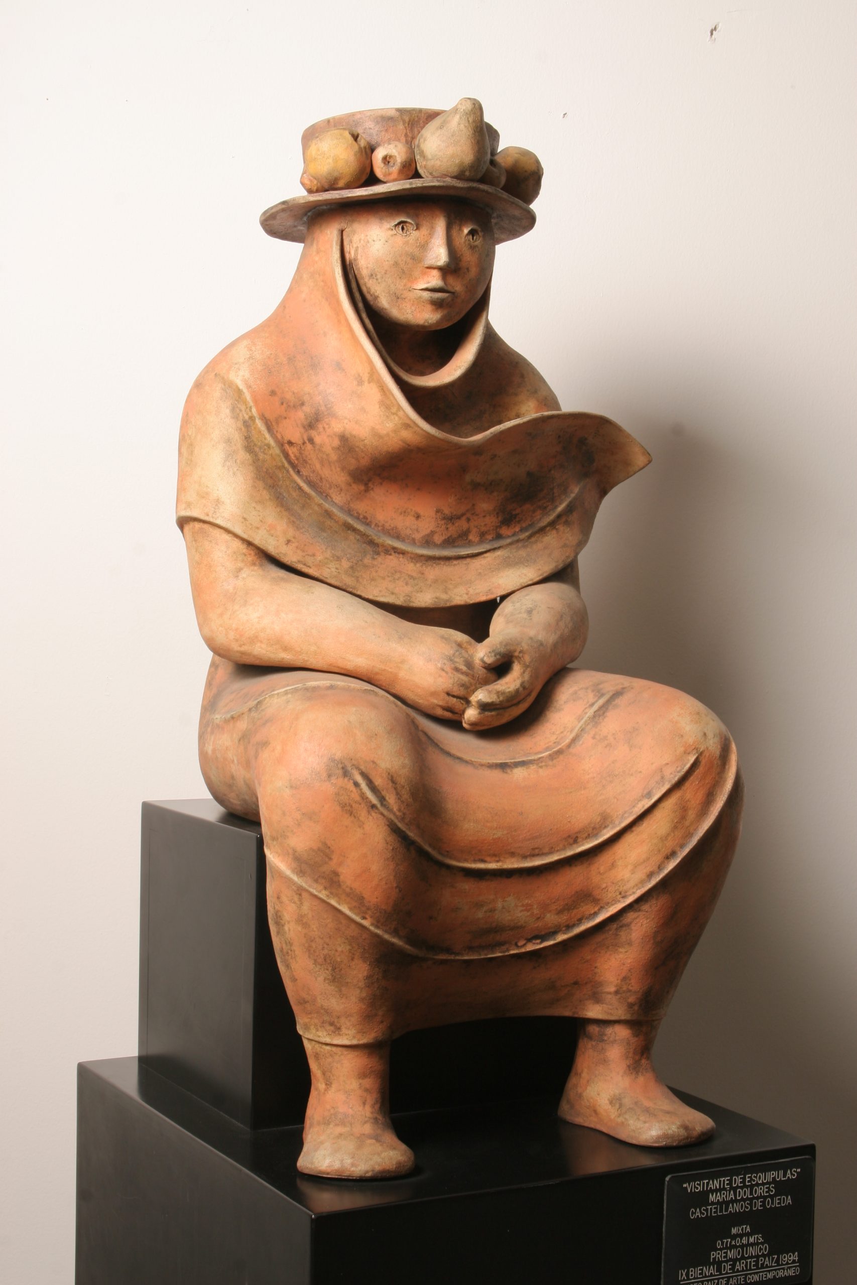 Antes de ser reconocida por sus delicadas esculturas de resina, María Dolores Castellanos experimentó con materiales como el barro horneado a alta temperatura. Un ejemplo de esta etapa es su obra Visitante de Esquipulas, la cual participó en la Bienal de Arte Paiz de 1994, donde la guatemalteca obtuvo el Glifo de Oro como único premio.